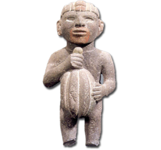 Escultura prehispánica de un hombre sujetando una vaina de cacao.